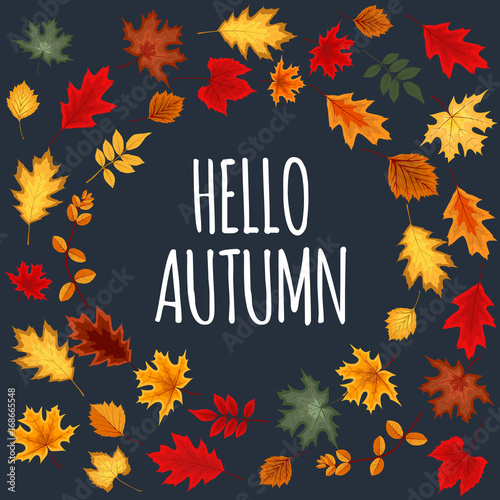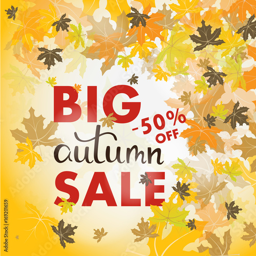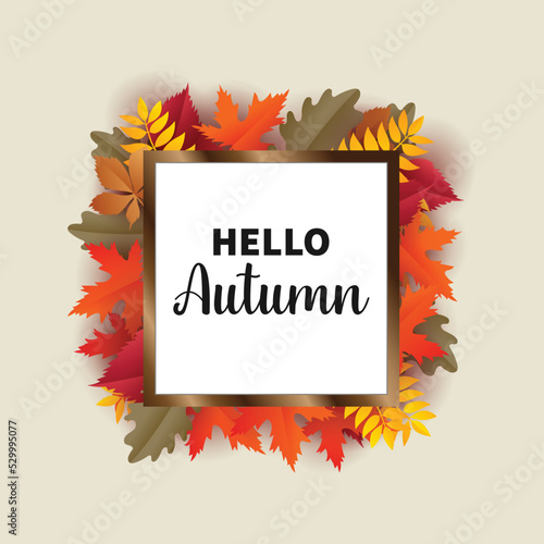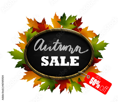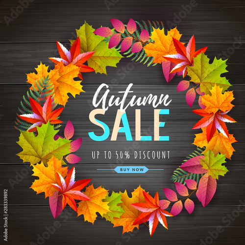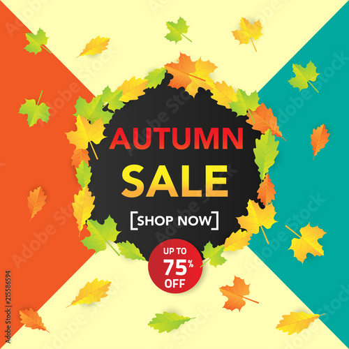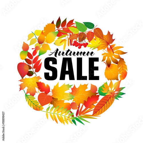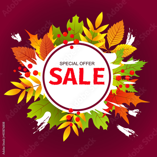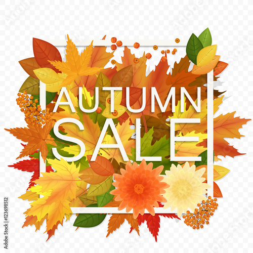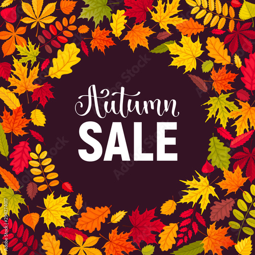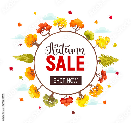 Podzimní výprodej sleva štítek plakát banner šablona. Vektorový papír řez kulatý sezónní podzimní rám s listy, jeřáb bobule, deštník, nápisy.
