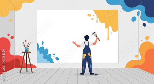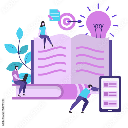 Obrovská kniha, padající žluté javorové listy a mikro mužské a ženské postavy chůzi na ulici s deštníkem, vektorové ilustrace. Složení podzimní sezóny pro webový banner, webovou stránku atd.