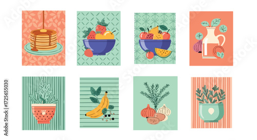 Podzimní sezóna vektorové plakáty. Farma a sklizeň zeleniny. Deštníkové boty a deštník. Horký čaj.
