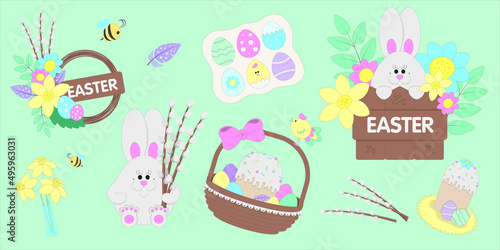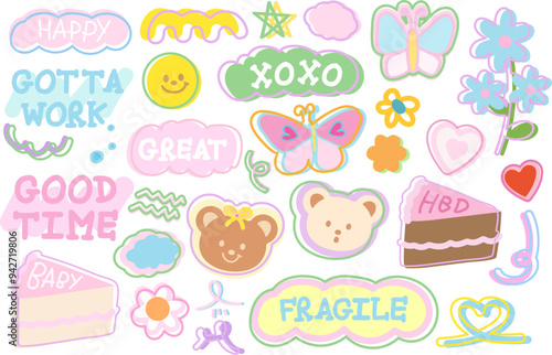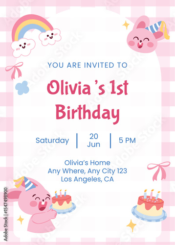 Sada šablon pozvánky na přání pro miminko. Vektorové ručně kreslené ilustrace roztomilých zvířat zajíčci, medvědi, dětské hračky, party dekorace, dárkové krabičky, dort a jiné sladkosti.