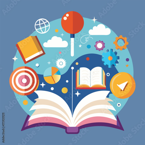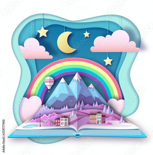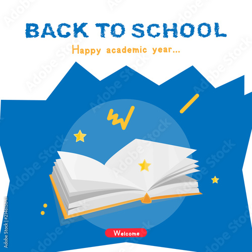 Zpět do školy papercut vector. Školní potřeby létající z otevřené knihy nad vědeckým pozadím vrstvené řemeslné umělecké ilustrace. První zářijová karta. Plakát Dne znalostí