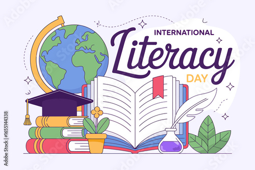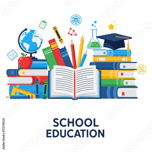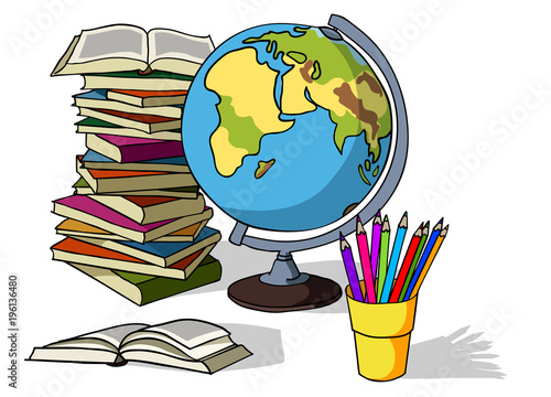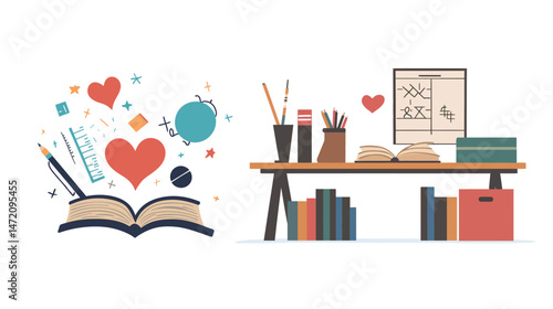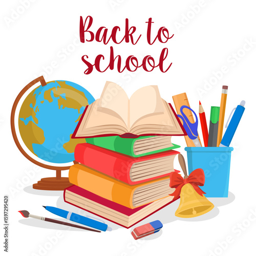 Zpět na školní potřeby a papírnictví vektorové ilustrace. Kniha a notebook, batoh s papírnictvím, zeměkoule a fotbalový míč. Koncept zahájení online vzdělávání a učení