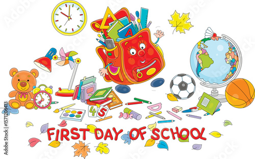 Zpět do školy vektorové ilustrace se vzdělávacími předměty maskot. Šťastný usmívající se nůžky barvy štětec pravítko budík učebnice školní brašna pero tužku charakter