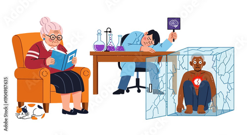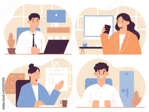 Pekárna obchod pracovník, pekař kreslená postavička set, vektorové ploché ilustrace. Muž hnětení těsta s váleček, pečení chleba, žena prodává dort a čerstvé sladké jídlo dezerty. Cukrářské služby.