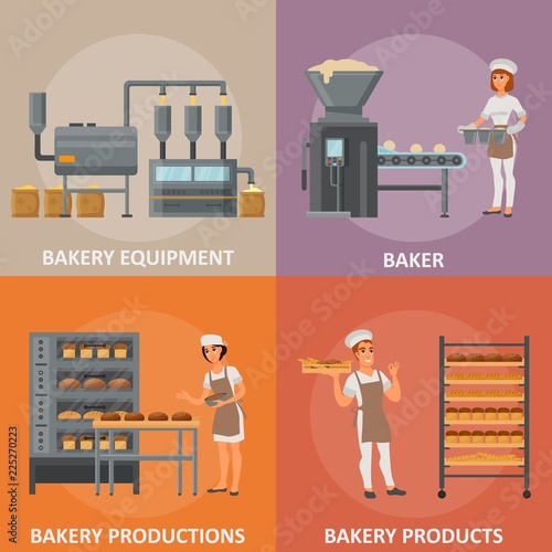 Pekárna vektorové plakát banner set. Pekařské vybavení, pekař, Pekařská výroba a pekařské výrobky prvky designu plochého stylu.