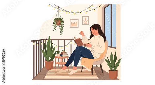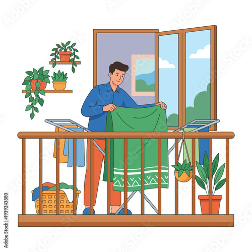 Mladá žena, zahradník zalévání rostlin na balkoně, ploché vektorové ilustrace. Dívka rostoucí Pokojové rostliny, ovoce a zeleninu v květináčích. Balkon zahradnictví. Městské zemědělství.