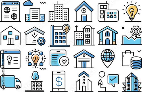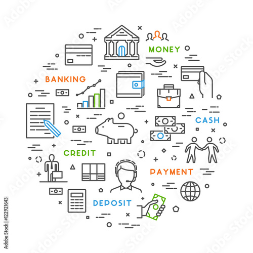 Vektorová ilustrace bankovního konceptu. Moderní tenká linie umění plochý styl designový prvek ve tvaru bankovní budovy s bankovními symboly, ikony pro webové stránky bannery a tiskovin.