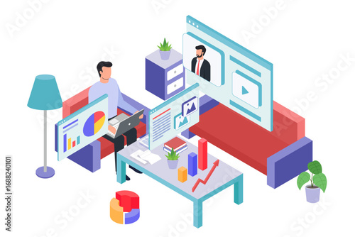 Vývojový diagram procesu hackování Bank. Vektorové izometrické ilustrace. Anonymní hacker programátor na sobě oblečení s kapucí krást peníze z bankovních účtů při používání notebooku.