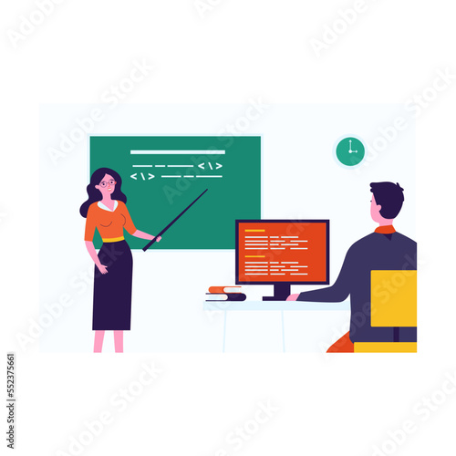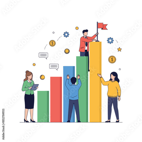 Vektorová ilustrace bankovní pokladní ženy a zákazníků mužů stojících vedle pokladny. Bank people concept plochý styl designové prvky, ikony izolované na bílém pozadí.