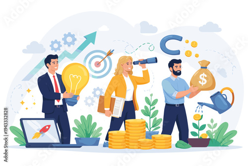Podnikatel zalévání peníze strom v hrnci, vektorový plochý styl designu ilustrace. Investice, zisk, tvorba a úspora peněz, finanční úspěch, složení bankovních vkladů pro plakát, banner atd.