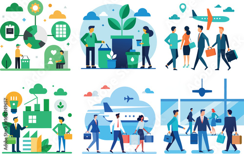 Vektorová ilustrace zaměstnanců banky, ozbrojených sběratelů, ostrahy a zákazníků stojících ve frontě u pokladny a bankomatu. Bankovní lidé, ikony izolované na bílém pozadí. Ploché designové prvky.