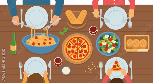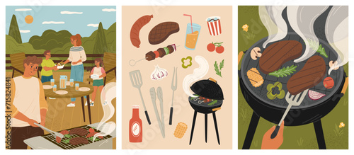 Grilovací party scéna se šťastnými lidmi, kteří vaří maso venku. Rodinné postavy grilování hovězího masa a klobásy se těší piknik party na dvorku vektorové ilustrace