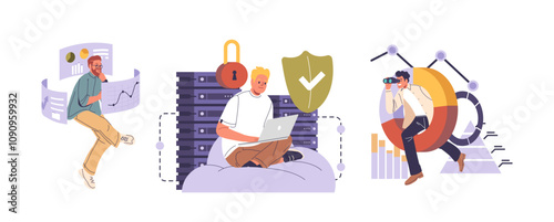Holič stříhá vlasy klienta v holičství, sada vektorových plakátů. Design interiéru holičství se židlemi, zrcadly. Kadeřník, kadeřník stříhání vlasů, dělá pánské účesy. Holičské doplňky.