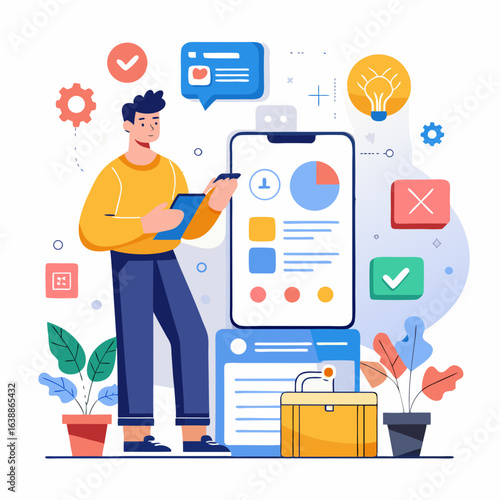 Holič nebo kadeřník pořadí koncept. Klient dává pozitivní zpětnou vazbu, lajky a psaní zpráv s pěknými recenzemi. Mobilní telefon obrazovka s aplikací v lidské ruce vektorové ilustrace