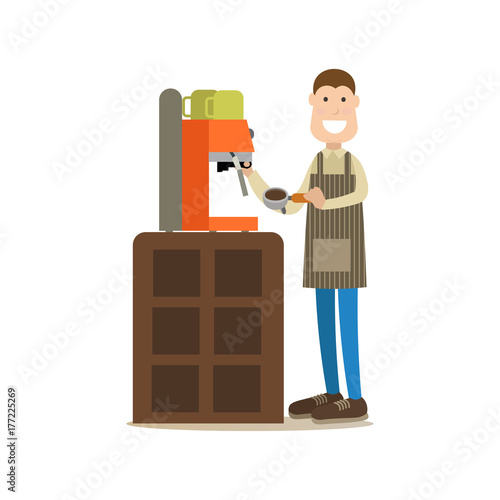 Vektorové ilustrace barista dělat kávu. Kavárna lidé plochý styl designový prvek, ikona izolované na bílém pozadí.