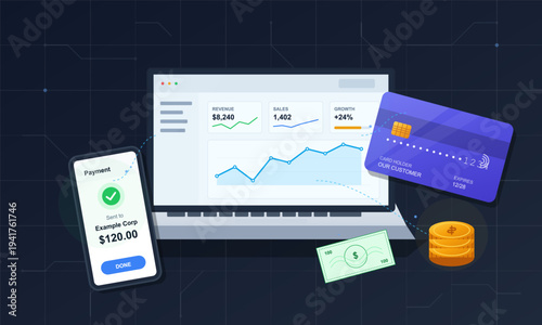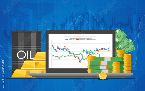 Barel ceny ropy graf vektorové ilustrace v plochém stylu. Burzovní graf na obrazovce notebooku. Hromada peněz, ropné nádrže.