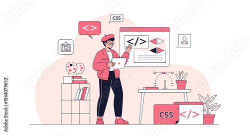 Interiér koupelny a dívka ve sprše, vektorové ploché ilustrace. Moderní sprchový kout, umyvadlo, zrcadlo a světla. Žena interiér koupelny.