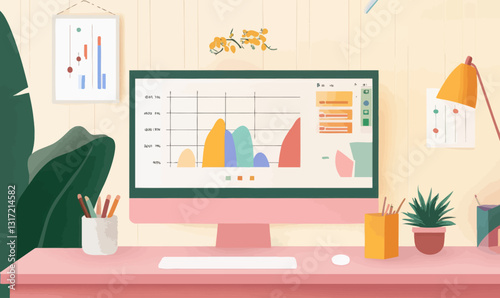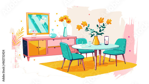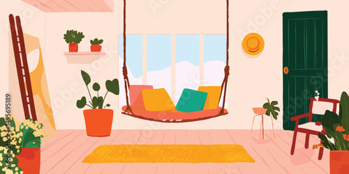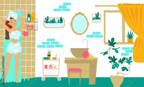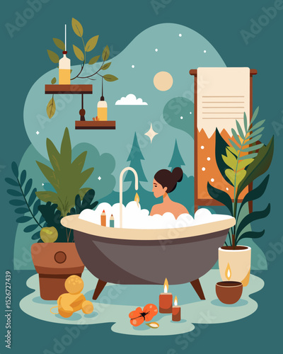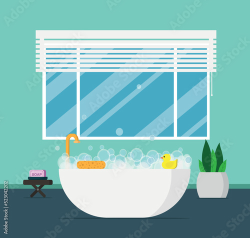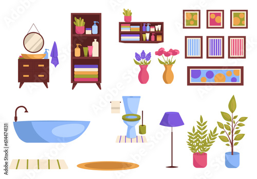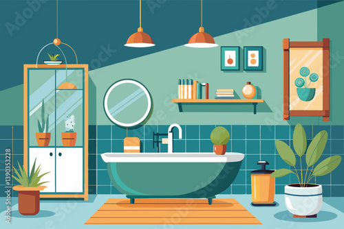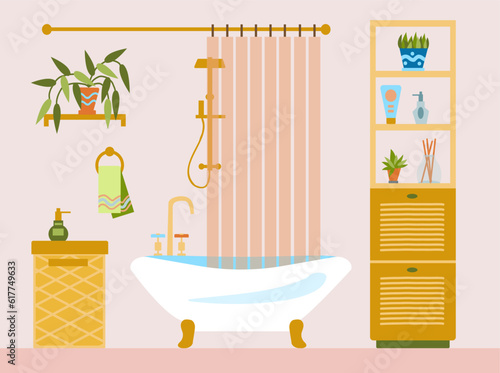 Interiér koupelny s vanou, toaletou a umyvadlem. Ručně kreslená vektorová ilustrace v útulném skandinávském stylu. Domácí interiérový design.