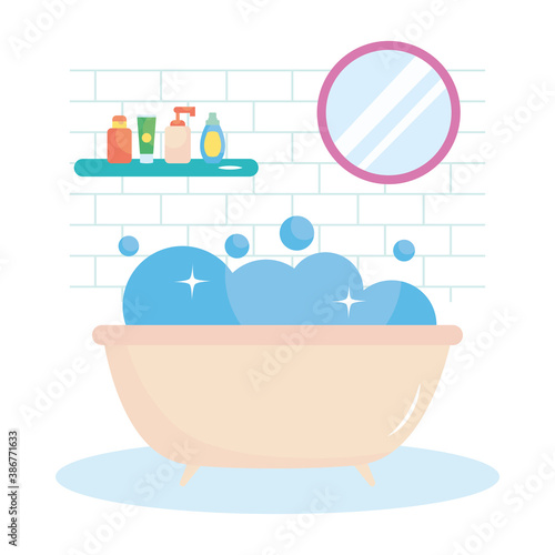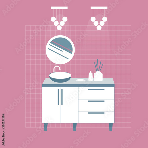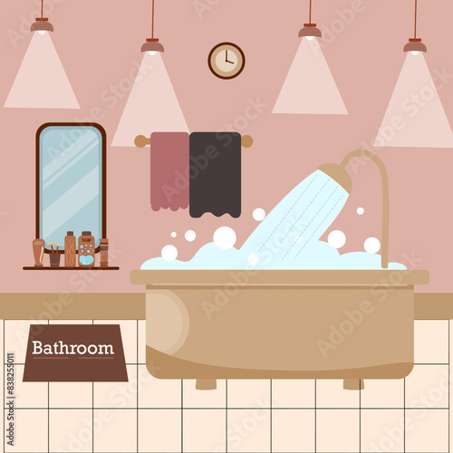 Koupelna s nábytkem plochý design interiéru vektorové ilustrace. Domácí toaleta pro odpočinek a relaxaci, mytí čistící hygienický postup s vanou, umyvadlem, zrcadlem, toaletou