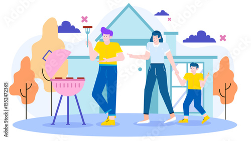 Šťastný pár s BBQ party, vektorové ilustrace. Šéfkuchař muž kreslená postavička grilování klobásy. Grilování a venkovní piknikové složení pro webový banner, webovou stránku atd.