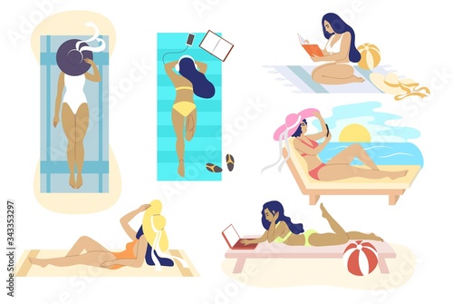Hezké dívky v plavkách opalování na pláži, vektorové ploché izolované ilustrace. Šťastné ženy relaxační, čtení knihy, pomocí notebooku, přičemž selfie u moře. Pláž dívky se těší letní dovolenou.