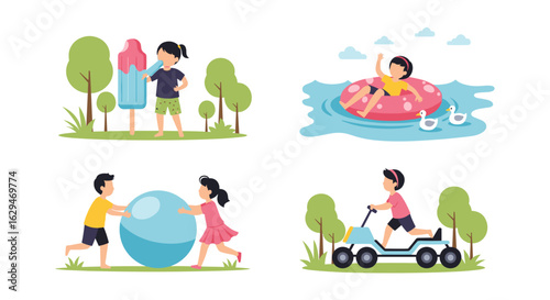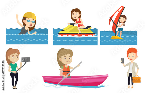 Vektorová ilustrace rekreantů, kteří odpočívají na pláži. Letní lidé symboly, ikony izolované na bílém pozadí. Plochý design.