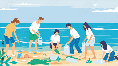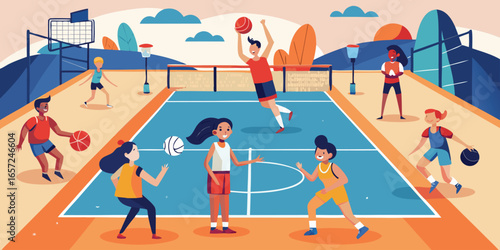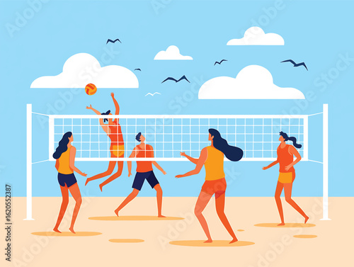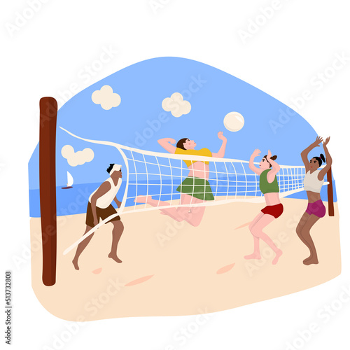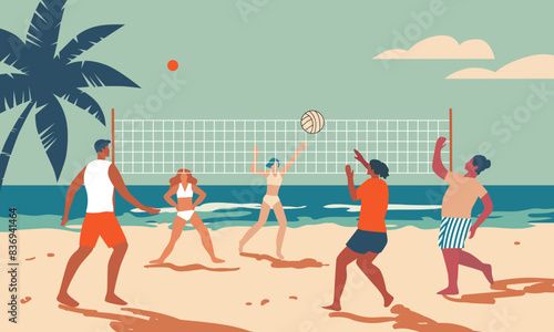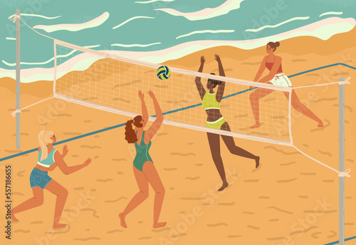 Plážový volejbal hráčky v akci vektorové plakát. Ženy volejbalový tým hrát hru v turnaji na pláži. Dívka útok a sloužit míč.
