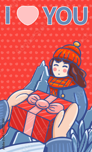 Krásná dívka v teplém klobouku a rukavicích drží horký nápoj. Zimní zahřátí koncept v retro komické pop art stylu.