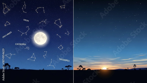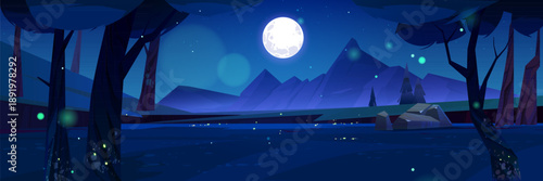 Měsíční noc, hvězdná obloha, měsíční mýtina na vodě jezera, vektorové ilustrace. Úplněk odraz na vodě ve tmě. Krásná romantická příroda krajina.
