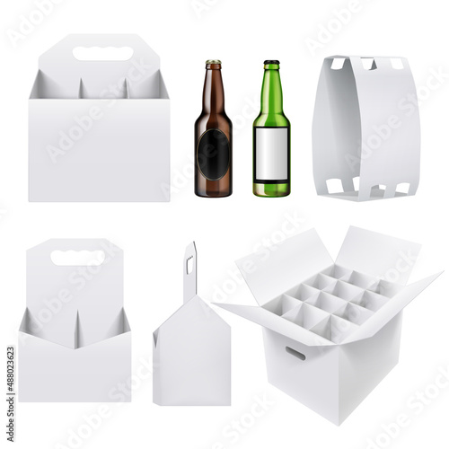 Šest balení s maketou lahví zeleného piva. Vektorové realistické ilustrace izolovaných na bílém pozadí.
