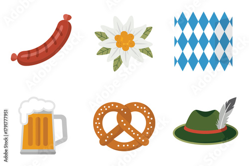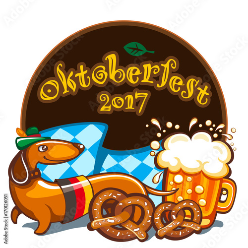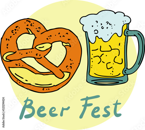 Pivní festival vektorové ploché ilustrace. Láhev a hrnek piva, preclík, pšeničné uši, chmel, vidlička s klobásou, otvírák na láhve. Koncept oslavy Oktoberfestu pro webový banner, webová stránka atd.
