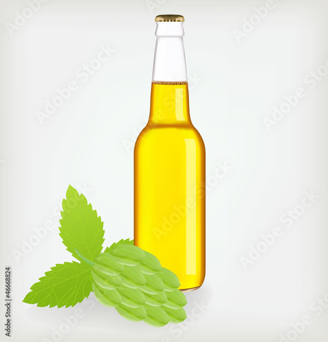 Sada ikon Beer pack. Vektorové realistické skleněné Pivní lahve, pšeničné uši, chmelové pupeny a listy izolovaných na bílém pozadí.