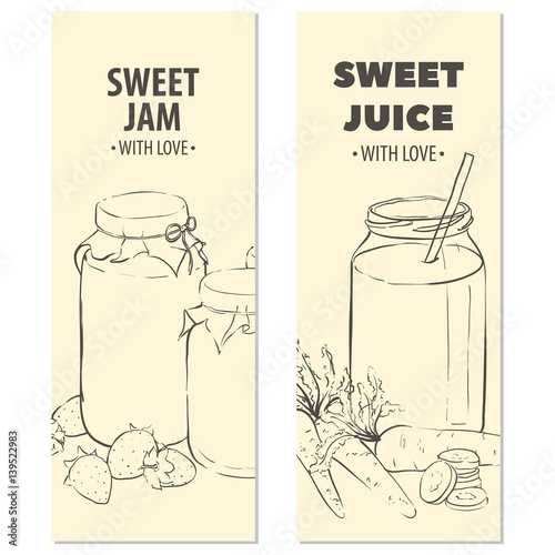 Berry juice plakát design šablony. Vektorové realistické skleněná láhev ovocné šťávy a ručně tažené jahody, třešně, maliny, borůvky, kopie prostor.