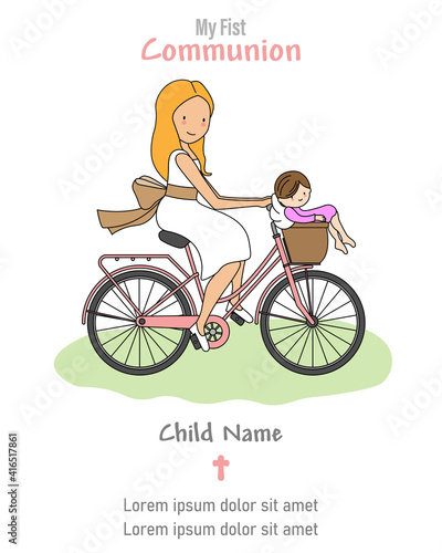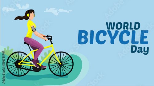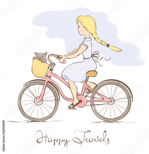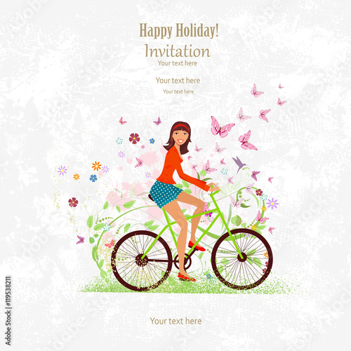 Koncept cyklistické dovolené vektorová ilustrace v plochém stylu. Mladá žena s nákupy na kole.