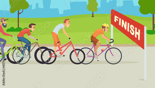 Cyklisté na kolech v městském parku. Cyklistika sportovní koncept cartoon bannery. Vektorová ilustrace v designu plochého stylu.