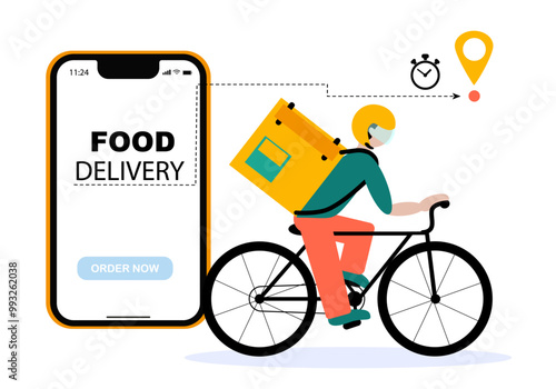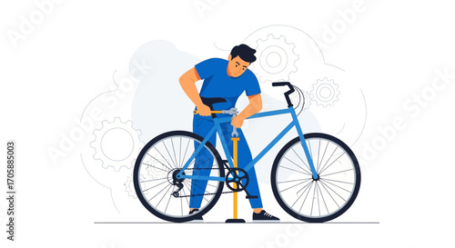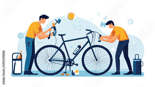 Obrovské kolo a mikro mužské a ženské postavy držící náhradní díly pro jízdní kola, vektorová ilustrace. Opravy a údržba jízdních kol složení pro webový banner, webovou stránku atd.