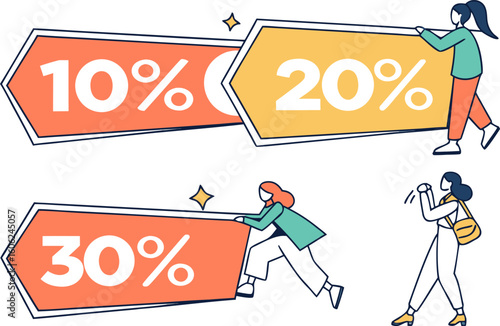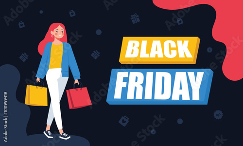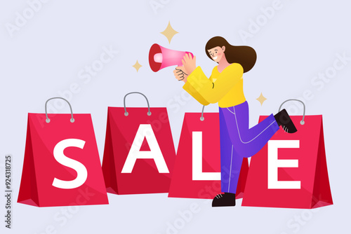Velký prodej propagace banner šablona. Ženské kreslené postavičky nakupování oblečení, ploché vektorové ilustrace. Šťastné ženy s nákupními taškami. Maloobchodní prodej a slevy leták, plakát atd.