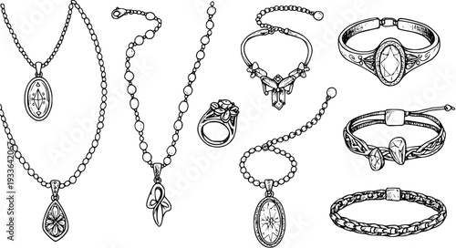 Bižuterie set vektorové inkoust ručně kreslené ilustrace izolovaných na bílém pozadí. Prsten, náhrdelník, náušnice, přívěsek, náramek doodle kolekce šperků.