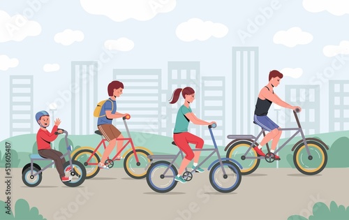 Vektorová ilustrace otce, který učí svého syna jezdit na kole. Péče o děti a rodičovství koncept plochý styl designový prvek.