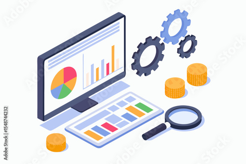 Kolo online vektorové ilustrace. 3D izometrická Cyklistická helma, brýle, kolo na klávesnici notebooku. Online nakupování, cyklistický servis, e-commerce koncept designové prvky izolované na bílém pozadí.