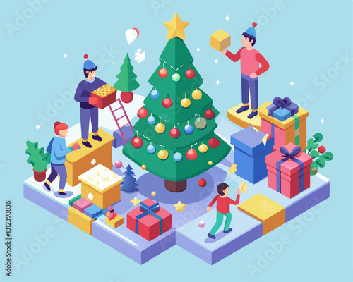 Oslava narozenin s dárky a dortem, ploché vektorové izometrické ilustrace. Chlapec dostává monopoly obchodní hra dárek k narozeninám.