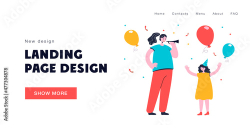 Narozeninová párty vektorová šablona webových stránek, design webových stránek a vstupních stránek pro vývoj webových stránek a mobilních stránek. Obrovské dárkové krabičky a šťastné mikro mužské a ženské postavy s dortem, skleničkami na víno.