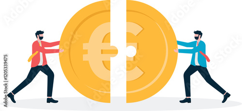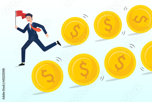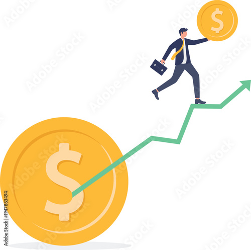 Bitcoin růst koncept vektorové ilustrace. Podnikatelé tlačí nahoru zlaté mince se symboly dolaru, eura, jenu, libry, bitcoin je před ostatními měnami.