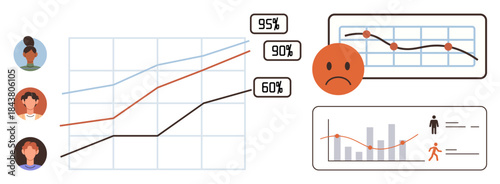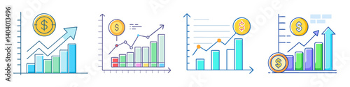 Bitcoin růst koncept vektorové ilustrace. Podnikatelé tlačí až zlaté mince s kryptoměna symboly, bitcoin je před druhým, bitcoin růst graf.