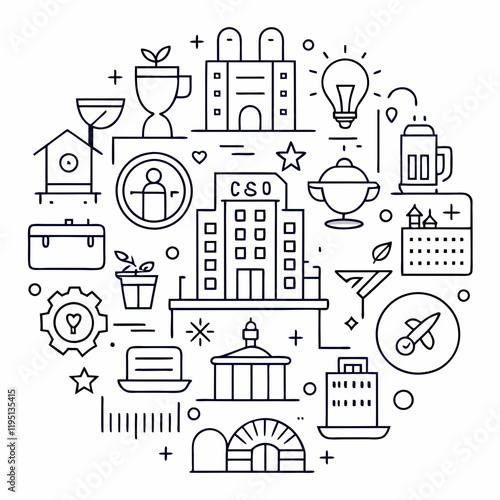 Bitcoin mining vektorový kulatý obrázek. Moderní tenká čára umění plochý styl designový prvek s digitální měny nebo kryptoměna těžební symboly, ikony.