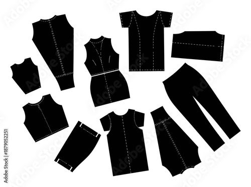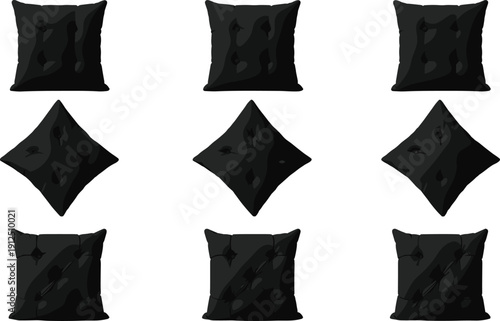 Černá vlající opona set, vektorové ilustrace izolovaných na bílém pozadí. Realistické lehké závěsy, okenní krytiny pro výzdobu interiéru.