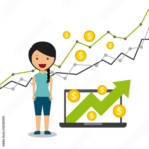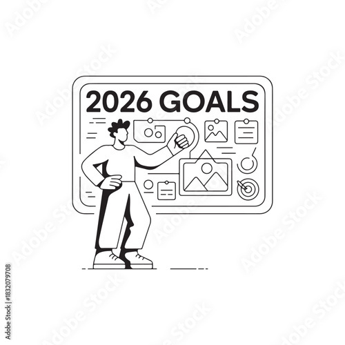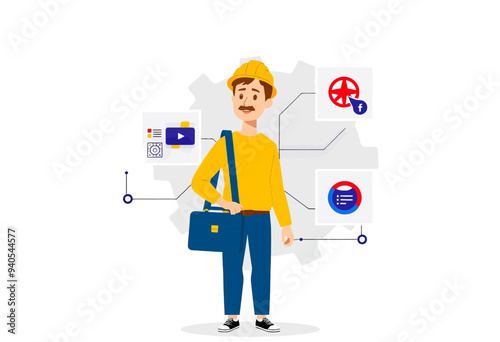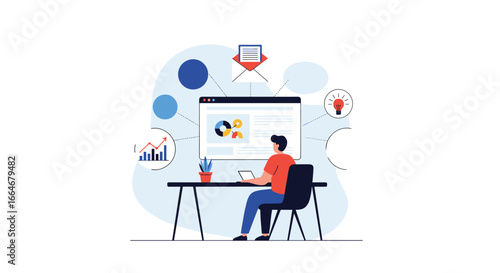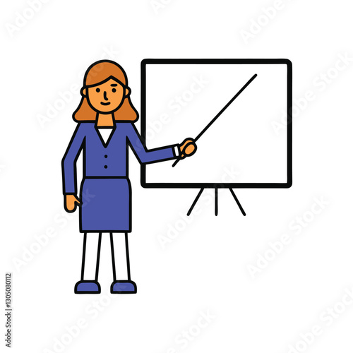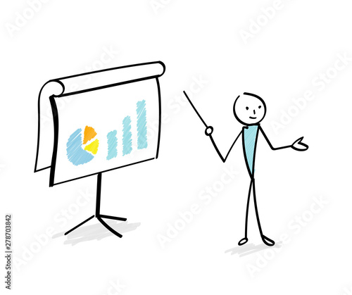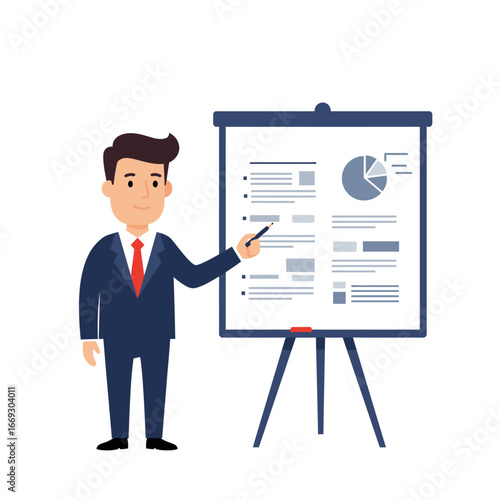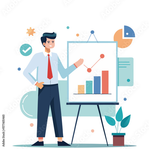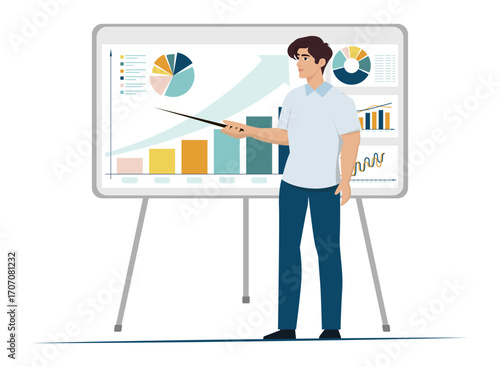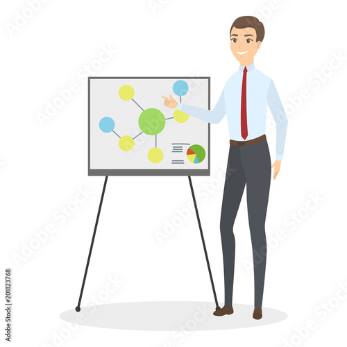 Vektorové ilustrace podnikatel řečník dává prezentaci toho, co je technologie blockchain pomocí vizuálních pomůcek. Koncept obchodní konference. Plochý styl designu.