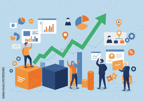 Modrý kancelářský počítač s budoucí technologií IP dashboard, podnikatelé. Vektorová ilustrace pro obchodní vizi, strategii, analýzu, futuristické technologie webový banner, webová stránka atd.