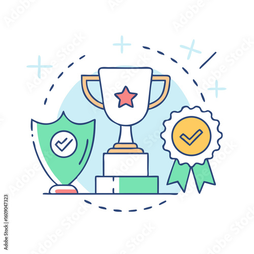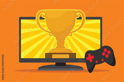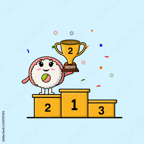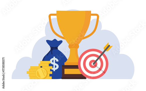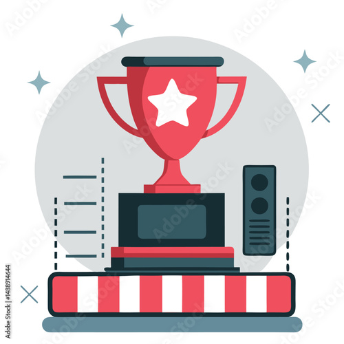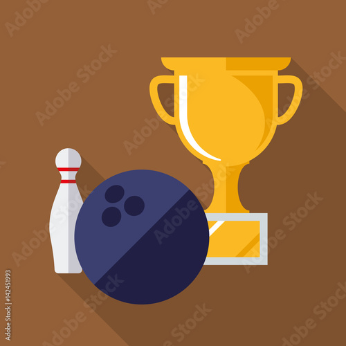 Bowling hra turnaj vítěz plakát šablony. Vektorové realistické ilustrace bowlingové koule, uličky, kuželky a pohár zlaté trofeje stojící na bílém pódiu.