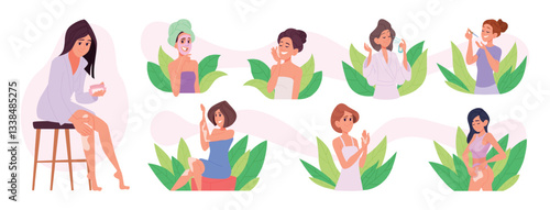 Příprava nevěsty a plánování svatebního obřadu izolovaná sada. Žena účes, svatební šaty šití, bachelorette Slepice-party organizace vektorové ilustrace. Koncept vedení dne oslav manželství